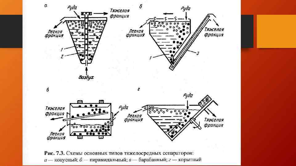 Тяжелосредная сепарация • Более тяжелые минералы погружаются в суспензию вследствие происходит разделение на всплывшие (легкой) и потонувшей (тяжелой) продукты. • Тяжелые суспензии применяемые при обогащении, представляют собой механическую взвесь тонкодисперсных частиц тяжелых минералов в воде.
