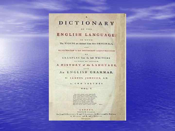 (3) The Beginning of Modern Dictionary Practice: The Eighteenth Century • • • 1755 Samuel Johnson It was the most comprehensive dictionary of English It had extensive etymologies, or word histories. The definitions generally were both complete and clear. The various senses or meanings of the same word were numbered and distinguished. Definitions were followed by quotations from reputable authors in order to illustrate the use of the word, thus adding another, most important dimension to definition.