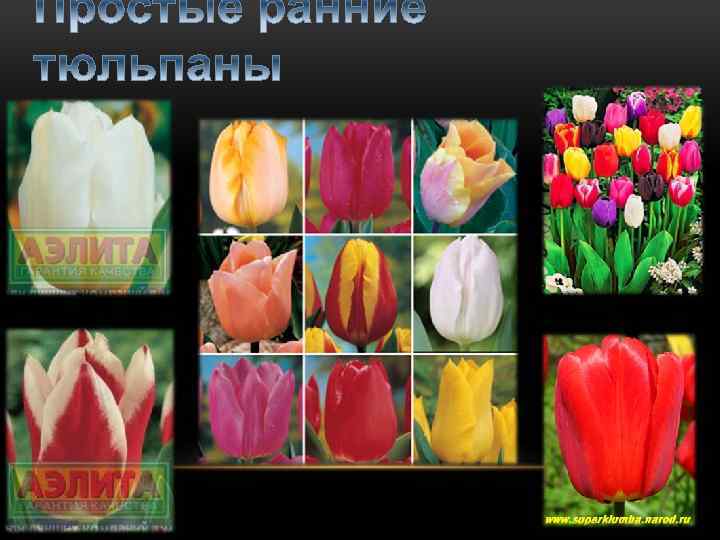 Классификация и сорта I группа — раноцветущие: 1 класс — Простые ранние тюльпаны; 2 класс — Махровые ранние тюльпаны. II группа — среднецветущие: 3 класс — Триумф-тюльпаны; 4 класс — Дарвиновы гибриды. III группа — поздноцветущие: 5 класс — Простые поздние тюльпаны; 6 класс — Лилиецветные тюльпаны; 7 класс — Бахромчатые тюльпаны; 8 класс — Зеленоцветные тюльпаны; 9 класс — Рембрандт-тюльпаны; 10 класс — Попугайные тюльпаны; 11 класс — Махровые поздние тюльпаны. IV группа — виды тюльпанов и их гибриды: 12 класс — тюльпаны Кауфмана, разновидности и гибриды; 13 класс — тюльпаны Фостера, разновидности и гибриды; 14 класс — тюльпаны Грейга, разновидности и