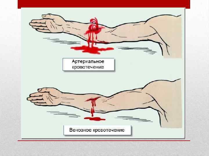 Артериальное кровотечение является самым опасным из всех видов кровотечений, т. к. может быстро наступить полное обескровливание пострадавшего. Наиболее опасны ранения крупных (магистральных) артерий — бедренной, плечевой, сонной; в этих случаях смерть может наступить в считанные минуты. -Ранение магистральной артерии определяется по фонтану крови и часто по характерному шипящему, пульсирующему звуку. Если есть подозрение, что повреждена артерия, ни в коем случае нельзя извлекать ранящий предмет, поскольку он служит затычкой, не позволяя начаться сильному артериальному кровотечению, которое может привести к быстрой смерти пострадавшего.