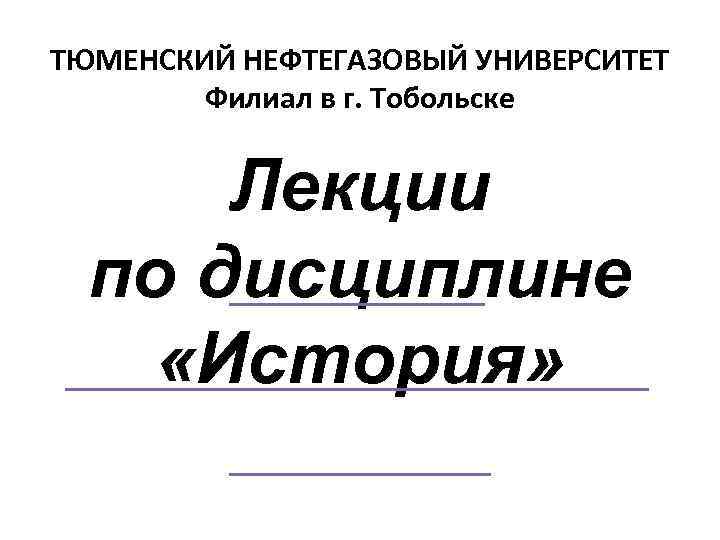 ТЮМЕНСКИЙ НЕФТЕГАЗОВЫЙ УНИВЕРСИТЕТ Филиал в г. Тобольске Лекции по дисциплине «История»