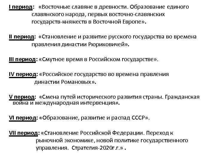 I период: «Восточные славяне в древности. Образование единого славянского народа, первых восточно-славянских государств-княжеств в Восточной Европе» . II период: «Становление и развитие русского государства во времена правления династии Рюриковичей» . III период: «Смутное время в Российском государстве» . IV период: «Российское государство во времена правления династии Романовых» . V период: «Смена путей исторического развития страны. Гражданская война и международная интервенция» . VI период: «Образование, развитие и распад СССР» . VII период: «Становление Российской Федерации. Переход к рыночной экономике, новой политике государственного управления. Стратегия-2020 г. г. » .