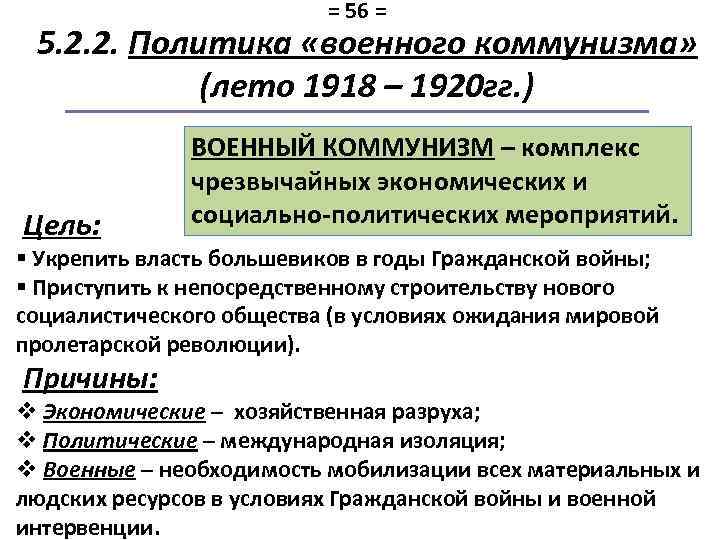 = 56 = 5. 2. 2. Политика «военного коммунизма» (лето 1918 – 1920 гг. ) Цель: ВОЕННЫЙ КОММУНИЗМ – комплекс чрезвычайных экономических и социально-политических мероприятий. § Укрепить власть большевиков в годы Гражданской войны; § Приступить к непосредственному строительству нового социалистического общества (в условиях ожидания мировой пролетарской революции). Причины: v Экономические – хозяйственная разруха; v Политические – международная изоляция; v Военные – необходимость мобилизации всех материальных и людских ресурсов в условиях Гражданской войны и военной интервенции.