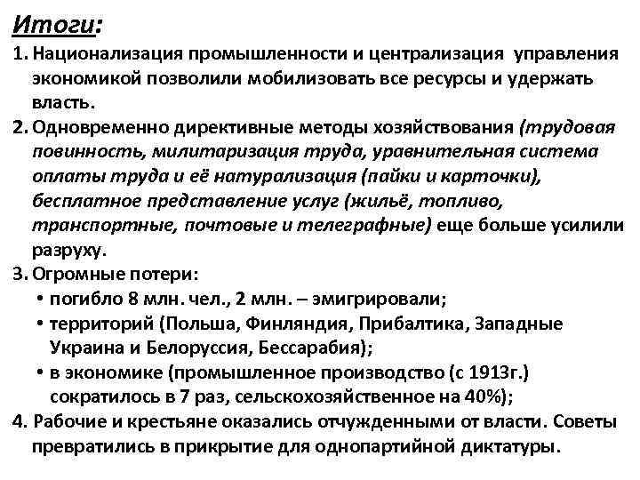 Итоги: 1. Национализация промышленности и централизация управления экономикой позволили мобилизовать все ресурсы и удержать власть. 2. Одновременно директивные методы хозяйствования (трудовая повинность, милитаризация труда, уравнительная система оплаты труда и её натурализация (пайки и карточки), бесплатное представление услуг (жильё, топливо, транспортные, почтовые и телеграфные) еще больше усилили разруху. 3. Огромные потери: • погибло 8 млн. чел. , 2 млн. – эмигрировали; • территорий (Польша, Финляндия, Прибалтика, Западные Украина и Белоруссия, Бессарабия); • в экономике (промышленное производство (с 1913 г. ) сократилось в 7 раз, сельскохозяйственное на 40%); 4. Рабочие и крестьяне оказались отчужденными от власти. Советы превратились в прикрытие для однопартийной диктатуры.