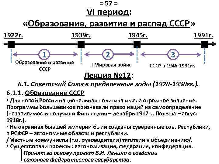 = 57 = VI период: «Образование, развитие и распад СССР» 1922 г. 1939 г. 1 Образование и развитие СССР 1945 г. 2 II Мировая война 1991 г. 3 СССР в 1946 -1991 гг. Лекция № 12: 6. 1. Советский Союз в предвоенные годы (1920 -1930 гг. ). 6. 1. 1. Образование СССР • Для новой России национальная политика имела огромное значение. Программы большевиков признавали право наций на самоопределение (независимость получили Финляндия – декабрь 1917 г. , Польша – август 1918 г. ). • На окраинах бывшей империи были созданы суверенные сов. Республики, в РСФСР – автономные области и республики. /Местные коммунисты (г. о. руководители) тяготели к объединению/. • Существовали проекты: автономизация, федерация, конфедерация. Принят за основу проект В. И. Ленина о создании союзного федеративного государства.