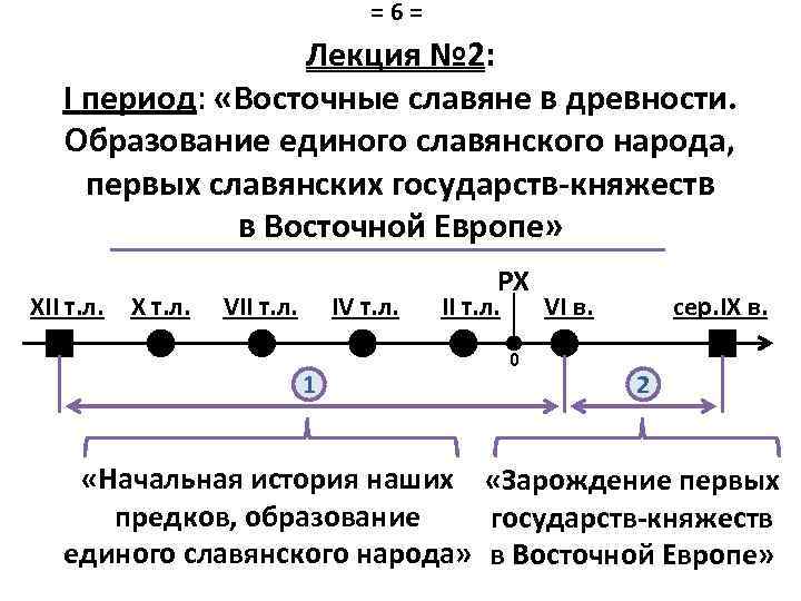 =6= Лекция № 2: I период: «Восточные славяне в древности. Образование единого славянского народа, первых славянских государств-княжеств в Восточной Европе» XII т. л. X т. л. VII т. л. IV т. л. 1 РХ II т. л. 0 VI в. сер. IX в. 2 «Начальная история наших «Зарождение первых предков, образование государств-княжеств единого славянского народа» в Восточной Европе»