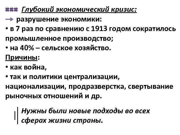 Глубокий экономический кризис: разрушение экономики: • в 7 раз по сравнению с 1913 годом сократилось промышленное производство; • на 40% – сельское хозяйство. Причины: • как война, • так и политики централизации, национализации, продразверстка, свертывание рыночных отношений и др. Нужны были новые подходы во всех сферах жизни страны.