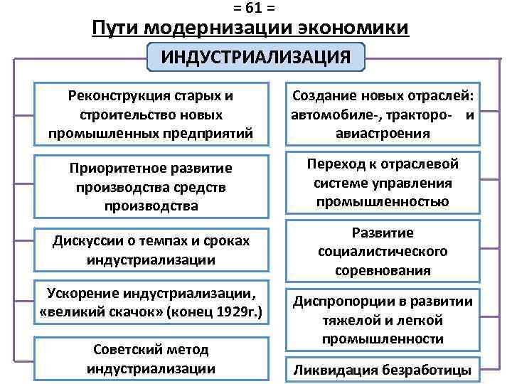 = 61 = Пути модернизации экономики ИНДУСТРИАЛИЗАЦИЯ Реконструкция старых и строительство новых промышленных предприятий Создание новых отраслей: автомобиле-, тракторо- и авиастроения Приоритетное развитие производства средств производства Переход к отраслевой системе управления промышленностью Дискуссии о темпах и сроках индустриализации Развитие социалистического соревнования Ускорение индустриализации, «великий скачок» (конец 1929 г. ) Советский метод индустриализации Диспропорции в развитии тяжелой и легкой промышленности Ликвидация безработицы