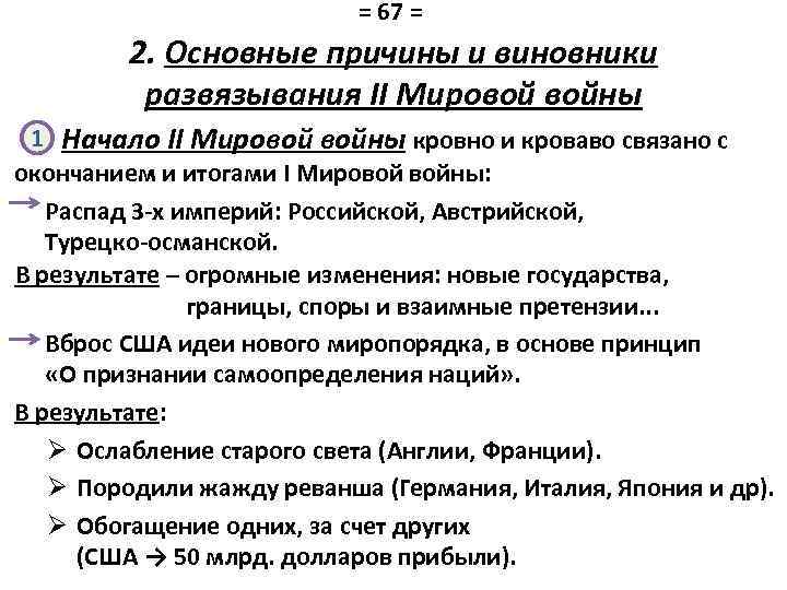 = 67 = 2. Основные причины и виновники развязывания II Мировой войны 1 Начало II Мировой войны кровно и кроваво связано с окончанием и итогами I Мировой войны: Распад 3 -х империй: Российской, Австрийской, Турецко-османской. В результате – огромные изменения: новые государства, границы, споры и взаимные претензии. . . Вброс США идеи нового миропорядка, в основе принцип «О признании самоопределения наций» . В результате: Ø Ослабление старого света (Англии, Франции). Ø Породили жажду реванша (Германия, Италия, Япония и др). Ø Обогащение одних, за счет других (США → 50 млрд. долларов прибыли).