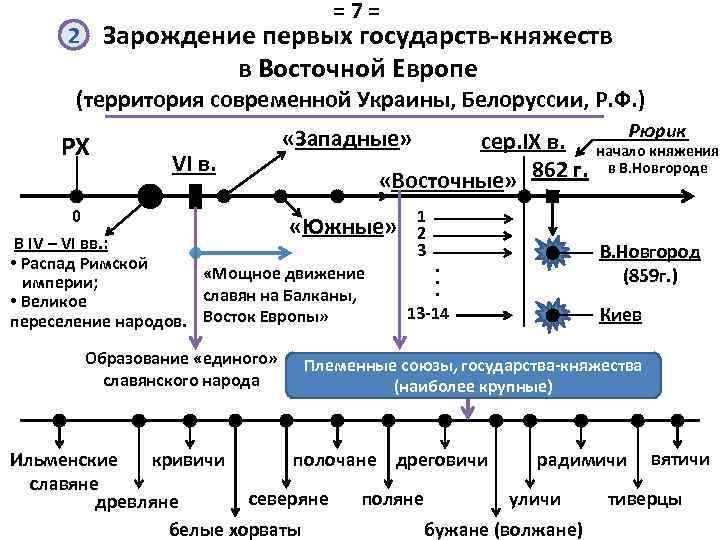 =7= 2 Зарождение первых государств-княжеств в Восточной Европе (территория современной Украины, Белоруссии, Р. Ф. ) РХ VI в. 0 «Западные» сер. IX в. «Восточные» 862 г. «Южные» В IV – VI вв. : • Распад Римской «Мощное движение империи; славян на Балканы, • Великое переселение народов. Восток Европы» Образование «единого» славянского народа 1 2 3 . . . 13 -14 Рюрик начало княжения в В. Новгороде В. Новгород (859 г. ) Киев Племенные союзы, государства-княжества (наиболее крупные) кривичи полочане дреговичи радимичи вятичи Ильменские славяне северяне поляне уличи тиверцы древляне белые хорваты бужане (волжане)