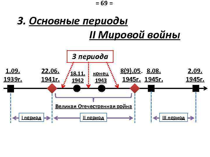 = 69 = 3. Основные периоды II Мировой войны 3 периода 1. 09. 1939 г. 22. 06. 1941 г. 18. 11. 1942 конец 1943 8(9). 05. 8. 08. 1945 г. Великая Отечественная война I период III период 2. 09. 1945 г.