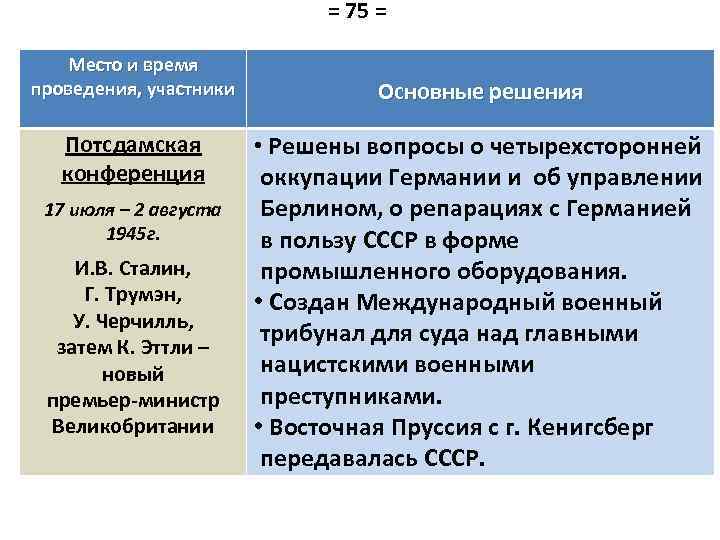 = 75 = Место и время проведения, участники Потсдамская конференция 17 июля – 2 августа 1945 г. И. В. Сталин, Г. Трумэн, У. Черчилль, затем К. Эттли – новый премьер-министр Великобритании Основные решения • Решены вопросы о четырехсторонней оккупации Германии и об управлении Берлином, о репарациях с Германией в пользу СССР в форме промышленного оборудования. • Создан Международный военный трибунал для суда над главными нацистскими военными преступниками. • Восточная Пруссия с г. Кенигсберг передавалась СССР.