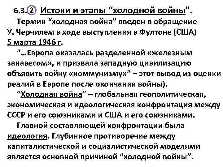 6. 3. 2 Истоки и этапы “холодной войны”. Термин “холодная война” введен в обращение У. Черчилем в ходе выступления в Фултоне (США) 5 марта 1946 г. “…Европа оказалась разделенной «железным занавесом» , и призвала западную цивилизацию объявить войну «коммунизму» ” – этот вывод из оценки реалий в Европе после окончания войны). “Холодная война” – глобальная геополитическая, экономическая и идеологическая конфронтация между СССР и его союзниками и США и его союзниками. Главной составляющей конфронтации была идеология. Глубинное противоречие между капиталистической и социалистической моделями является основной причиной “холодной войны”.