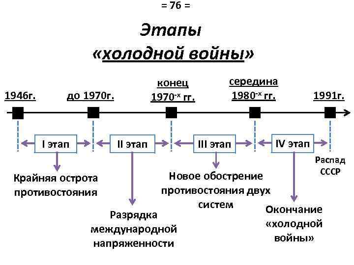 = 76 = Этапы «холодной войны» 1946 г. конец 1970 -х гг. до 1970 г. I этап II этап Крайняя острота противостояния середина 1980 -х гг. III этап 1991 г. IV этап Распад СССР Новое обострение противостояния двух систем Окончание Разрядка международной напряженности «холодной войны»