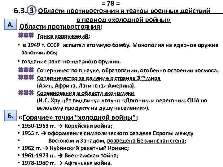 = 78 = 6. 3. 3 Области противостояния и театры военных действий в период «холодной войны» А. Области противостояния: Гонка вооружений: • в 1949 г. СССР испытал атомную бомбу. Монополия на ядерное оружие закончилось; • создание ракетно-ядерного оружия. Соперничество в науке, образовании, особенно освоении космоса. Соперничество за влияние в странах 3 -го мира (Азия, Африка, Латинская Америка). Соревнование в области экономики (Н. С. Хрущёв выдвинул лозунг: «Догоним и перегоним США по валовому продукту на душу населения» ). Б. «Горячие» точки “холодной войны”: • 1950 -1953 гг. → Корейская война; • 1955 г. → оформление символического раздела Европы между • Востоком и Западом, возведена Берлинская стена; • 1962 гг. → Кубинский ракетный Кризис; • 1961 -1973 гг. → Вьетнамская война; • 1978 -1989 гг. → Афганская война.