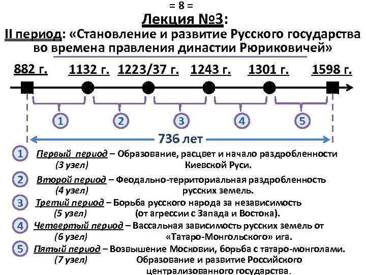 =8= Лекция № 3: II период: «Становление и развитие Русского государства во времена правления династии Рюриковичей» 882 г. 1132 г. 1223/37 г. 1243 г. 1301 г. 1598 г. 1 1 2 3 4 5 736 лет Первый период – Образование, расцвет и начало раздробленности (3 узел) Киевской Руси. Второй период – Феодально-территориальная раздробленность (4 узел) русских земель. Третий период – Борьба русского народа за независимость (5 узел) (от агрессии с Запада и Востока). Четвертый период – Вассальная зависимость русских земель от (6 узел) «Татаро-Монгольского» ига. Пятый период – Возвышение Московии, борьба с татаро-монголами. (7 узел) Образование и развитие Российского централизованного государства.