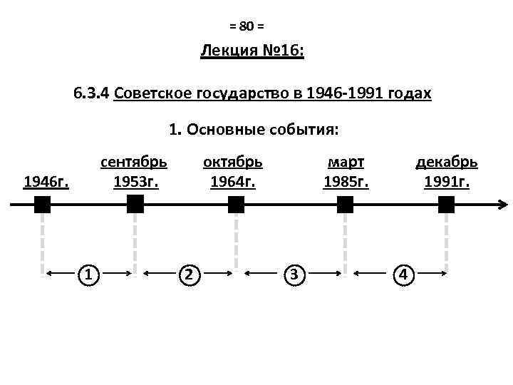 = 80 = Лекция № 16: 6. 3. 4 Советское государство в 1946 -1991 годах 1. Основные события: сентябрь 1953 г. 1946 г. 1 октябрь 1964 г. 2 март 1985 г. 3 декабрь 1991 г. 4