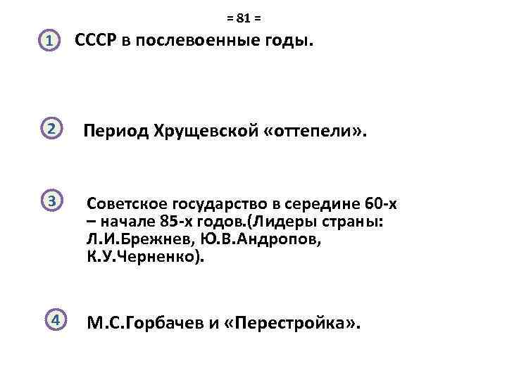 = 81 = 1 СССР в послевоенные годы. 2 Период Хрущевской «оттепели» . 3 Советское государство в середине 60 -х – начале 85 -х годов. (Лидеры страны: Л. И. Брежнев, Ю. В. Андропов, К. У. Черненко). 4 М. С. Горбачев и «Перестройка» .