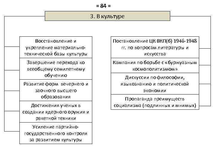 = 84 = 3. В культуре Восстановление и укрепление материальнотехнической базы культуры Постановление ЦК ВКП(б) 1946 -1948 гг. по вопросам литературы и искусства Завершение перехода ко всеобщему семилетнему обучению Кампания по борьбе с «буржуазным космополитизмом» Развитие форм вечернего и заочного высшего образования Достижения ученых в создании ядерного оружия и ракетной техники Усиление партийногосударственного контроля за развитием культуры Дискуссии по философии, языкознанию и политической экономии Пропаганда преимуществ социализма (подлинных и мнимых)