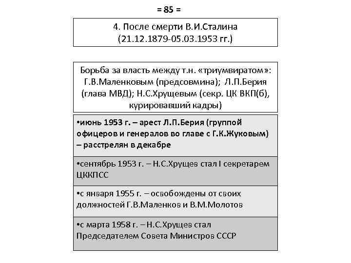 = 85 = 4. После смерти В. И. Сталина (21. 12. 1879 -05. 03. 1953 гг. ) Борьба за власть между т. н. «триумвиратом» : Г. В. Маленковым (предсовмина); Л. П. Берия (глава МВД); Н. С. Хрущевым (секр. ЦК ВКП(б), курировавший кадры) • июнь 1953 г. – арест Л. П. Берия (группой офицеров и генералов во главе с Г. К. Жуковым) – расстрелян в декабре • сентябрь 1953 г. – Н. С. Хрущев стал I секретарем ЦККПСС • с января 1955 г. – освобождены от своих должностей Г. В. Маленков и В. М. Молотов • с марта 1958 г. – Н. С. Хрущев стал Председателем Совета Министров СССР
