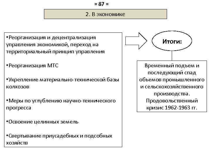 = 87 = 2. В экономике • Реорганизация и децентрализация управления экономикой, переход на территориальный принцип управления • Реорганизация МТС • Укрепление материально-технической базы колхозов • Меры по углублению научно-технического прогресса • Освоение целинных земель • Свертывание приусадебных и подсобных хозяйств Итоги: Временный подъем и последующий спад объемов промышленного и сельскохозяйственного производства. Продовольственный кризис 1962 -1963 гг.