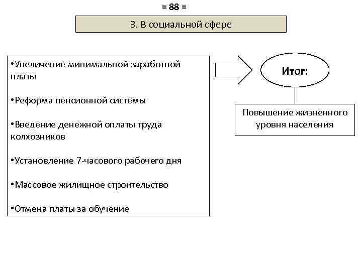 = 88 = 3. В социальной сфере • Увеличение минимальной заработной платы • Реформа пенсионной системы • Введение денежной оплаты труда колхозников • Установление 7 -часового рабочего дня • Массовое жилищное строительство • Отмена платы за обучение Итог: Повышение жизненного уровня населения