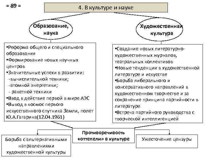= 89 = 4. В культуре и науке Образование, наука Художественная культура • Реформа общего и специального образования • Формирование новых научных центров • Значительные успехи в развитии: -вычислительной техники; -атомной энергетики; - ракетной техники • Ввод в действие первой в мире АЭС • Вывод в космос первого искусственного спутника Земли, полет Ю. А. Гагарина(12. 04. 1961) Борьба с альтернативными направлениями художественной культуры • Создание новых литературнохудожественных журналов, театральных коллективов • Новые тенденции в художественной литературе и искусстве • Борьба либерального и консервативного направлений в художественном творчестве и за сохранение принципа партийности в литературе • Встреча партийного руководства с творческой интеллигенцией Противоречивость «оттепели» в культуре Ужесточение цензуры