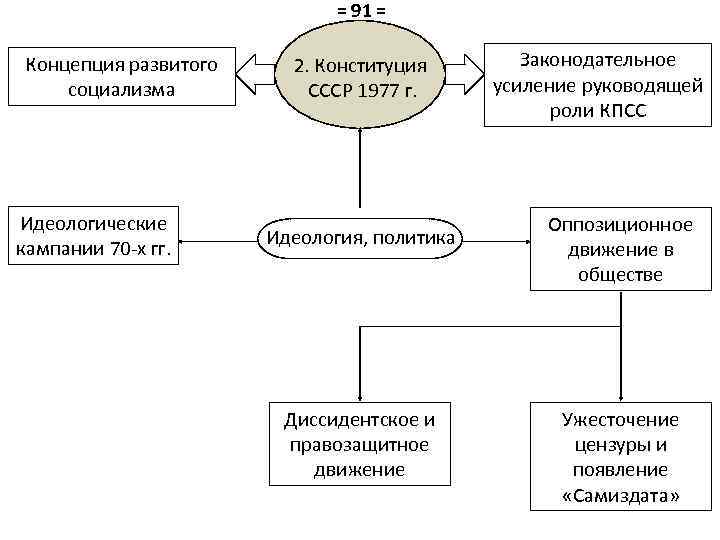 = 91 = Концепция развитого социализма Идеологические кампании 70 -х гг. 2. Конституция СССР 1977 г. Идеология, политика Диссидентское и правозащитное движение Законодательное усиление руководящей роли КПСС Оппозиционное движение в обществе Ужесточение цензуры и появление «Самиздата»