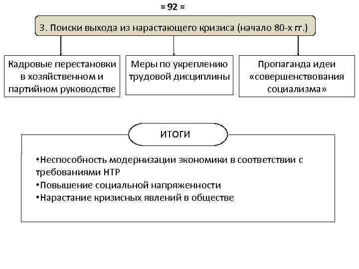 = 92 = 3. Поиски выхода из нарастающего кризиса (начало 80 -х гг. ) Кадровые перестановки в хозяйственном и партийном руководстве Меры по укреплению трудовой дисциплины Пропаганда идеи «совершенствования социализма» ИТОГИ • Неспособность модернизации экономики в соответствии с требованиями НТР • Повышение социальной напряженности • Нарастание кризисных явлений в обществе