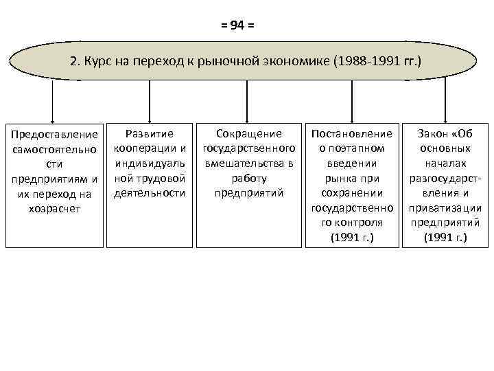 = 94 = 2. Курс на переход к рыночной экономике (1988 -1991 гг. ) Предоставление самостоятельно сти предприятиям и их переход на хозрасчет Развитие кооперации и индивидуаль ной трудовой деятельности Сокращение государственного вмешательства в работу предприятий Постановление о поэтапном введении рынка при сохранении государственно го контроля (1991 г. ) Закон «Об основных началах разгосударствления и приватизации предприятий (1991 г. )