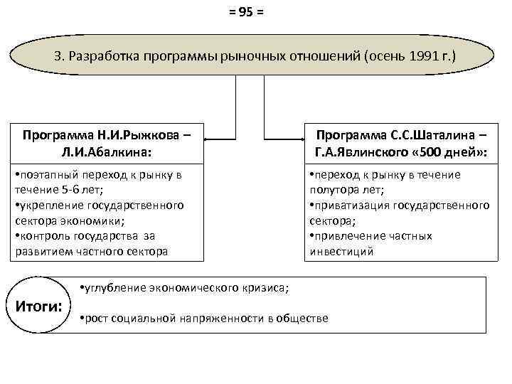 = 95 = 3. Разработка программы рыночных отношений (осень 1991 г. ) Программа Н. И. Рыжкова – Л. И. Абалкина: • поэтапный переход к рынку в течение 5 -6 лет; • укрепление государственного сектора экономики; • контроль государства за развитием частного сектора Программа С. С. Шаталина – Г. А. Явлинского « 500 дней» : • переход к рынку в течение полутора лет; • приватизация государственного сектора; • привлечение частных инвестиций • углубление экономического кризиса; Итоги: • рост социальной напряженности в обществе