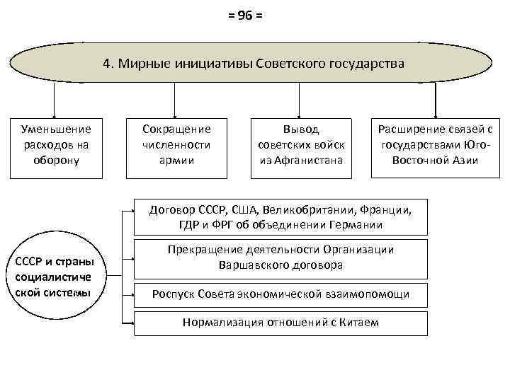 = 96 = 4. Мирные инициативы Советского государства Уменьшение расходов на оборону Сокращение численности армии Вывод советских войск из Афганистана Расширение связей с государствами Юго. Восточной Азии Договор СССР, США, Великобритании, Франции, ГДР и ФРГ об объединении Германии СССР и страны социалистиче ской системы Прекращение деятельности Организации Варшавского договора Роспуск Совета экономической взаимопомощи Нормализация отношений с Китаем