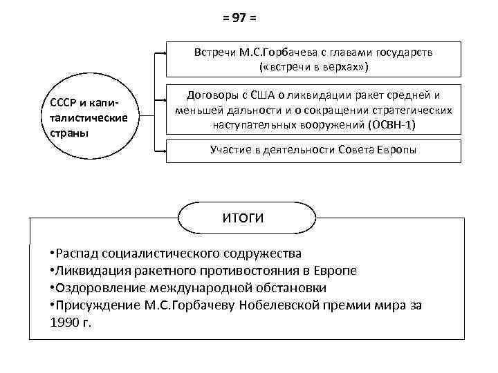 = 97 = Встречи М. С. Горбачева с главами государств ( «встречи в верхах» ) СССР и капиталистические страны Договоры с США о ликвидации ракет средней и меньшей дальности и о сокращении стратегических наступательных вооружений (ОСВН-1) Участие в деятельности Совета Европы ИТОГИ • Распад социалистического содружества • Ликвидация ракетного противостояния в Европе • Оздоровление международной обстановки • Присуждение М. С. Горбачеву Нобелевской премии мира за 1990 г.