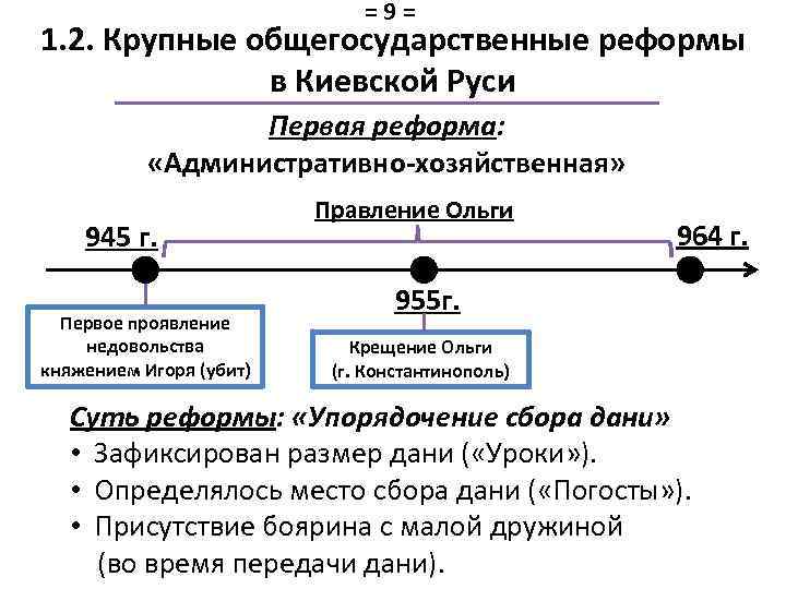 =9= 1. 2. Крупные общегосударственные реформы в Киевской Руси Первая реформа: «Административно-хозяйственная» 945 г. Первое проявление недовольства княжением Игоря (убит) Правление Ольги 964 г. 955 г. Крещение Ольги (г. Константинополь) Суть реформы: «Упорядочение сбора дани» • Зафиксирован размер дани ( «Уроки» ). • Определялось место сбора дани ( «Погосты» ). • Присутствие боярина с малой дружиной (во время передачи дани).