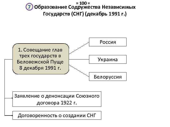 = 100 = 7 Образование Содружества Независимых Государств (СНГ) (декабрь 1991 г. ) Россия 1. Совещание глав трех государств в Беловежской Пуще 8 декабря 1991 г. Украина Белоруссия Заявление о денонсации Союзного договора 1922 г. Договоренность о создании СНГ