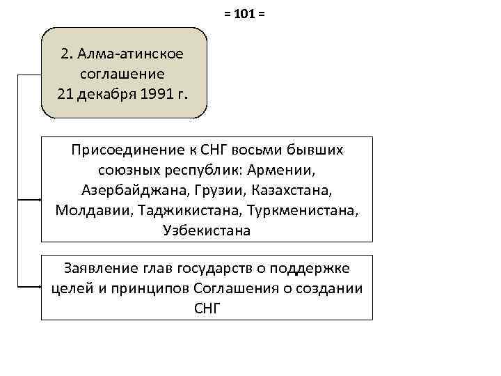 = 101 = 2. Алма-атинское соглашение 21 декабря 1991 г. Присоединение к СНГ восьми бывших союзных республик: Армении, Азербайджана, Грузии, Казахстана, Молдавии, Таджикистана, Туркменистана, Узбекистана Заявление глав государств о поддержке целей и принципов Соглашения о создании СНГ