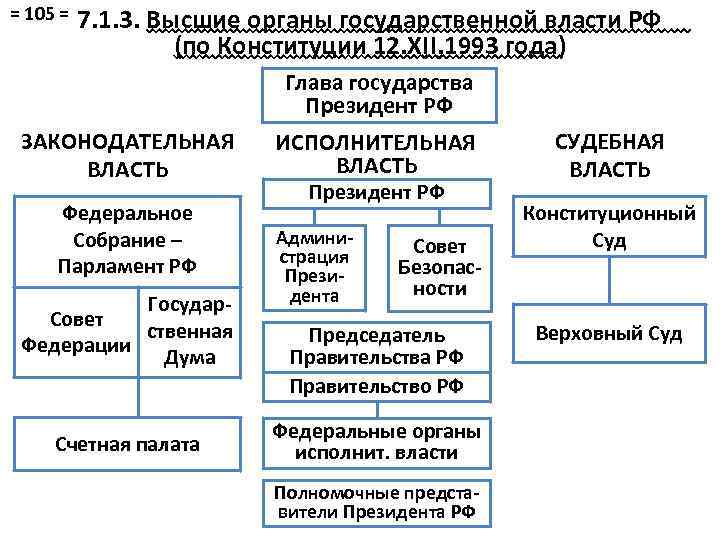= 105 = 7. 1. 3. Высшие органы государственной власти РФ (по Конституции 12. XII. 1993 года) Глава государства Президент РФ ЗАКОНОДАТЕЛЬНАЯ ВЛАСТЬ Федеральное Собрание – Парламент РФ Государ. Совет ственная Федерации Дума Счетная палата ИСПОЛНИТЕЛЬНАЯ ВЛАСТЬ Президент РФ Администрация Президента Совет Безопасности Председатель Правительства РФ Правительство РФ Федеральные органы исполнит. власти Полномочные представители Президента РФ СУДЕБНАЯ ВЛАСТЬ Конституционный Суд Верховный Суд
