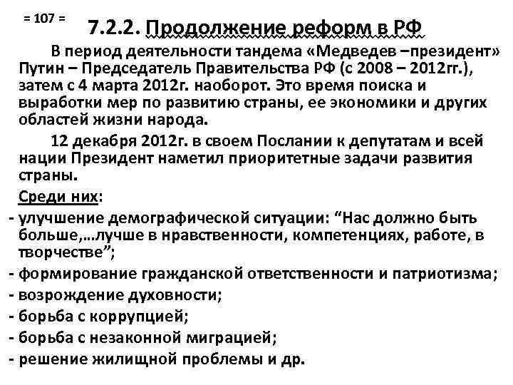 = 107 = 7. 2. 2. Продолжение реформ в РФ В период деятельности тандема «Медведев –президент» Путин – Председатель Правительства РФ (с 2008 – 2012 гг. ), затем с 4 марта 2012 г. наоборот. Это время поиска и выработки мер по развитию страны, ее экономики и других областей жизни народа. 12 декабря 2012 г. в своем Послании к депутатам и всей нации Президент наметил приоритетные задачи развития страны. Среди них: - улучшение демографической ситуации: “Нас должно быть больше, …лучше в нравственности, компетенциях, работе, в творчестве”; - формирование гражданской ответственности и патриотизма; - возрождение духовности; - борьба с коррупцией; - борьба с незаконной миграцией; - решение жилищной проблемы и др.