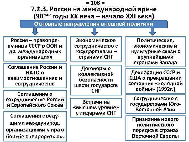 = 108 = 7. 2. 3. Россия на международной арене (90 -ые годы XX века – начало XXI века) Основные направления внешней политики Россия – правопреемница СССР в ООН и др. международных организациях Экономическое сотрудничество с государствами – странами СНГ Соглашение России и НАТО о взаимоотношениях и сотрудничестве Договоры о коллективной безопасности шести государств СНГ Соглашение о сотрудничестве России и Европейского Союза Соглашения с ведущими международ. организациями мира о борьбе с терроризмом Встречи на «высшем уровне» с лидерами СНГ Политические, экономические и культурные связи с крупнейшими странами Запада Декларация СССР и США о прекращении состояния «холодной войны» (1992 г. ) Сотрудничество с государствами Юго. Восточной Азии Признание нового политического порядка в странах Восточной Европы