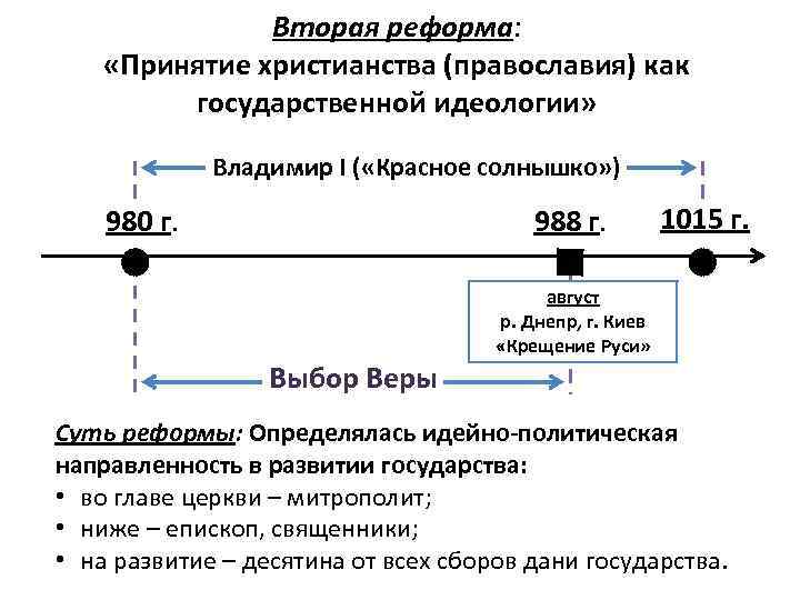 Вторая реформа: «Принятие христианства (православия) как государственной идеологии» Владимир I ( «Красное солнышко» ) 980 г. 988 г. 1015 г. август р. Днепр, г. Киев «Крещение Руси» Выбор Веры Суть реформы: Определялась идейно-политическая направленность в развитии государства: • во главе церкви – митрополит; • ниже – епископ, священники; • на развитие – десятина от всех сборов дани государства.