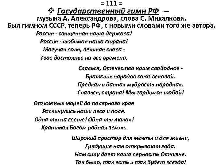 = 111 = v Государственный гимн РФ — музыка А. Александрова, слова С. Михалкова. Был гимном СССР, теперь РФ, с новыми словами того же автора. Россия - священная наша держава! Россия - любимая наша страна! Могучая воля, великая слава Твое достоянье на все времена. Славься, Отечество наше свободное Братских народов союз вековой. Предками данная мудрость народная. Славься, страна! Мы гордимся тобой! От южных морей до полярного края Раскинулись наши леса и поля. Одна ты на свете! Одна ты такая! Хранимая Богом родная земля. Широкий простор для мечты и для жизни, Грядущие нам открывают года. Нам силу дает наша верность Отчизне. Так было, так есть и так будет всегда! всегда