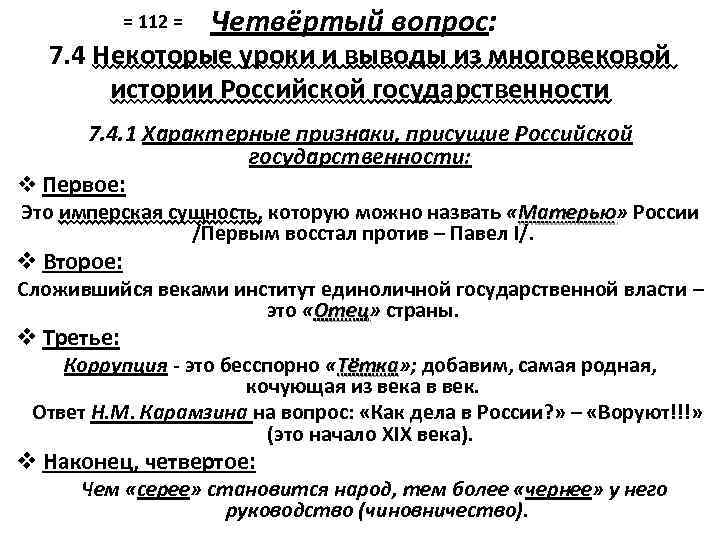 = 112 = Четвёртый вопрос: 7. 4 Некоторые уроки и выводы из многовековой истории Российской государственности 7. 4. 1 Характерные признаки, присущие Российской государственности: v Первое: Это имперская сущность, которую можно назвать «Матерью» России Матерью /Первым восстал против – Павел I/. v Второе: Сложившийся веками институт единоличной государственной власти – это «Отец» страны. Отец v Третье: Коррупция - это бесспорно «Тётка» ; добавим, самая родная, Тётка кочующая из века в век. Ответ Н. М. Карамзина на вопрос: «Как дела в России? » – «Воруют!!!» (это начало XIX века). v Наконец, четвертое: Чем «серее» становится народ, тем более «чернее» у него руководство (чиновничество).