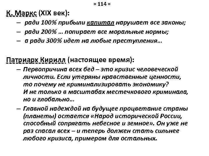 = 114 = К. Маркс (XIX век): – ради 100% прибыли капитал нарушает все законы; – ради 200% … попирает все моральные нормы; – а ради 300% идет на любые преступления… Патриарх Кирилл (настоящее время): – Первопричина всех бед – это кризис человеческой личности. Если утеряны нравственные ценности, то почему не криминализировать экономику? И не только в масштабах местечкового криминала, но и глобально… – Главной надеждой на будущее процветание страны (планеты) остается «Народ исторической России, способный сопрягать небесное и земное» . Он уже не раз спасал всех – и теперь должен стать сильнее любого кризиса, примером для остальных.