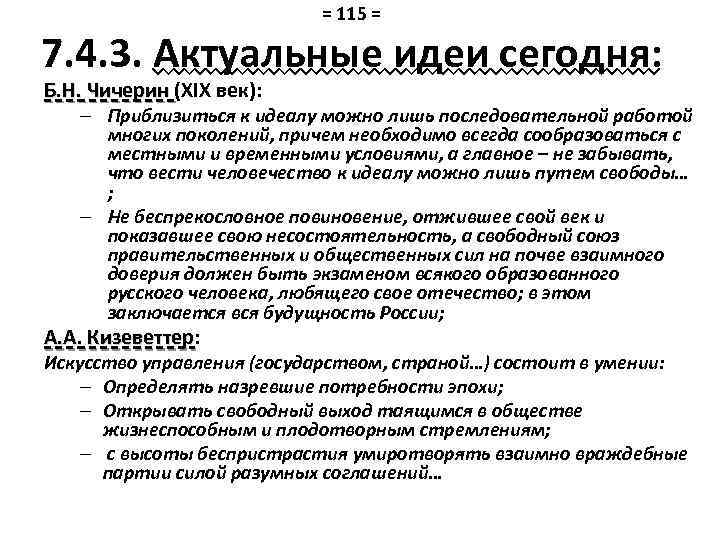 = 115 = 7. 4. 3. Актуальные идеи сегодня: Б. Н. Чичерин (XIX век): – Приблизиться к идеалу можно лишь последовательной работой многих поколений, причем необходимо всегда сообразоваться с местными и временными условиями, а главное – не забывать, что вести человечество к идеалу можно лишь путем свободы… ; – Не беспрекословное повиновение, отжившее свой век и показавшее свою несостоятельность, а свободный союз правительственных и общественных сил на почве взаимного доверия должен быть экзаменом всякого образованного русского человека, любящего свое отечество; в этом заключается вся будущность России; А. А. Кизеветтер: Кизеветтер Искусство управления (государством, страной…) состоит в умении: – Определять назревшие потребности эпохи; – Открывать свободный выход таящимся в обществе жизнеспособным и плодотворным стремлениям; – с высоты беспристрастия умиротворять взаимно враждебные партии силой разумных соглашений…