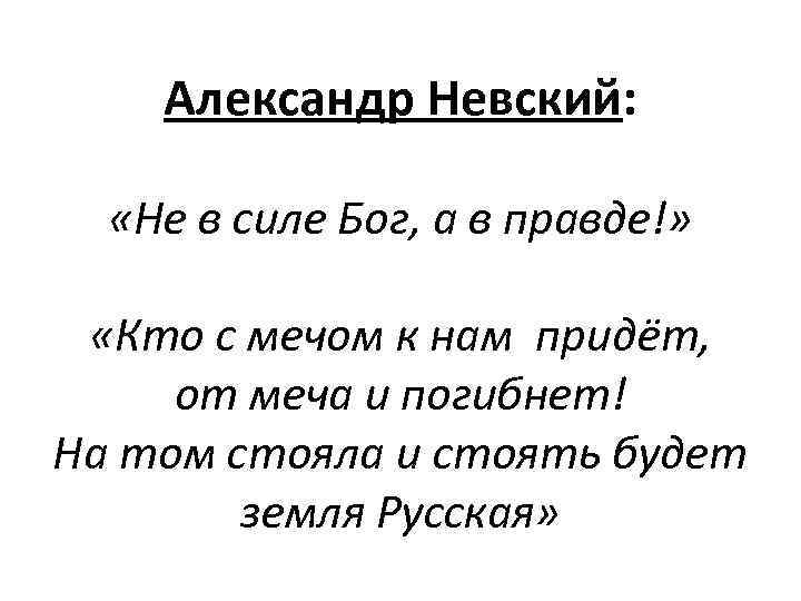 Александр Невский: «Не в силе Бог, а в правде!» «Кто с мечом к нам придёт, от меча и погибнет! На том стояла и стоять будет земля Русская»