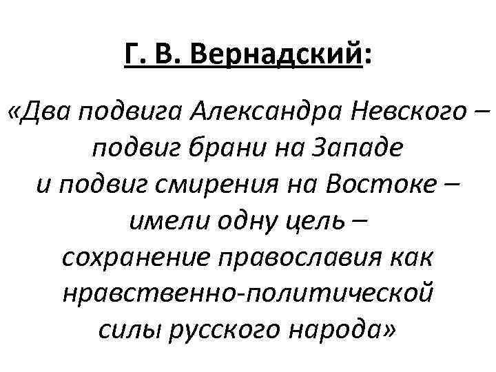 Г. В. Вернадский: «Два подвига Александра Невского – подвиг брани на Западе и подвиг смирения на Востоке – имели одну цель – сохранение православия как нравственно-политической силы русского народа»
