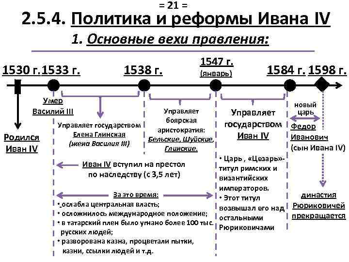 = 21 = 2. 5. 4. Политика и реформы Ивана IV 1. Основные вехи правления: 1530 г. 1533 г. 1538 г. Умер Василий III Родился Иван IV 1547 г. (январь) Управляет боярская Управляет государством аристократия: Елена Глинская Бельские, Шуйские, (жена Василия III) Глинские. 1584 г. 1598 г. новый царь Управляет государством Федор Иван IV Иванович (сын Ивана IV) • Царь , «Цезарь» титул римских и византийских императоров. За это время: династия • Этот титул • ослабла центральная власть; возвышал его над Рюриковичей • осложнилось международное положение; прекращается остальными • в татарский плен было угнано более 100 тыс. Рюриковичами Иван IV вступил на престол по наследству (с 3, 5 лет) русских людей; • разворована казна, процветали пытки, казни, ссылки людей и т. д.