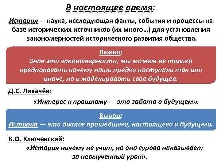 В настоящее время: История – наука, исследующая факты, события и процессы на базе исторических источников (их много…) для установления закономерностей исторического развития общества. Важно: Зная эти закономерности, мы можем не только предполагать почему наши предки поступали так или иначе, но и моделировать свое будущее. Д. С. Лихачёв: «Интерес к прошлому — это забота о будущем» . Вывод: История — это диалог прошедшего, настоящего и будущего. В. О. Ключевский: «История ничему не учит, но она сурово наказывает за невыученный урок» .