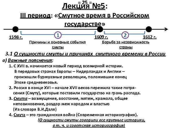 = 25 = Лекция № 5: III период: «Смутное время в Российском государстве» 1598 г. 1 Причины и основные события смуты 1609 г. 2 1612 г. Борьба за независимость страны 3. 1 О сущности смуты и причинах смутного времени в России а) Важные пояснения: 1. С XVII в. начинается новый период всемирной истории. В передовых странах Европы – Нидерландах и Англии – произошли буржуазные революции, положившие конец Эпохе средневековья. 2. Россия в конце XVI – начале XVII веков пережила такие потрясения (Смуту), которые поставили государство на грань распада. 3. Смута – возмущение, восстание, мятеж, крамола, общее неповиновение, раздор меж народом и властью (Из словаря В. И. Даля) 4. Смута – это гражданская война (Современная историография). (О сущности смуты говорили все крупные историки, в т. ч. и советская историография)