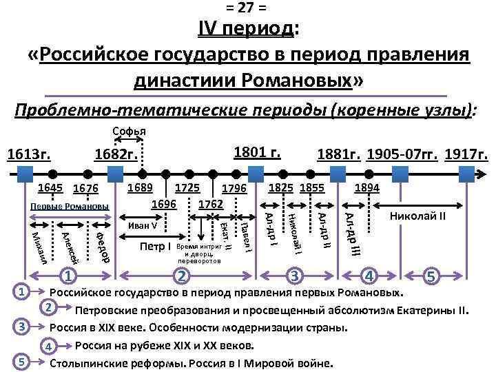 = 27 = IV период: «Российское государство в период правления династиии Романовых» Проблемно-тематические периоды (коренные узлы): Софья 1613 г. 1801 г. 1682 г. 1645 1676 Первые Романовы 1689 1725 1796 1696 1762 1825 1855 1894 Николай II II Ал-др I I 3 Ал-др I й. I Никола Ал-др I I 2 Павел Время интриг и дворц. переворотов I ор 5 Фед 3 ксей Але аил Мих 1 1 Петр I Екат. I Иван V 1881 г. 1905 -07 гг. 1917 г. 4 5 Российское государство в период правления первых Романовых. 2 Петровские преобразования и просвещенный абсолютизм Екатерины II. Россия в XIX веке. Особенности модернизации страны. Россия на рубеже XIX и XX веков. 4 Столыпинские реформы. Россия в I Мировой войне.